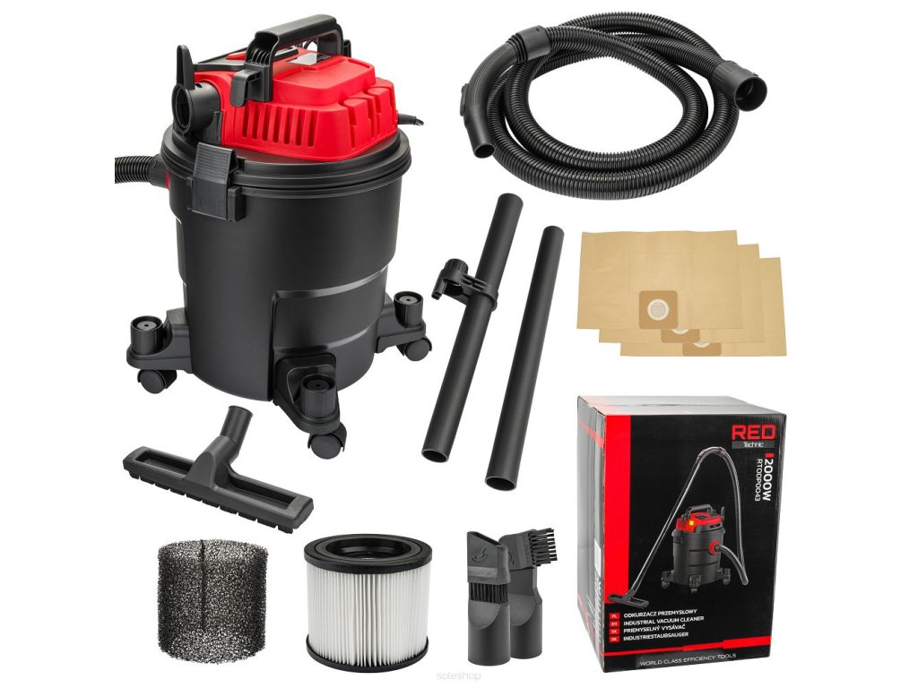 Průmyslový vysavač RTODP0043 značky RED TECHNIC je univerzální a spolehlivé zařízení, které se skvěle hodí pro použití v dílně, garáži, zahradě, i v domácnosti. Náš produkt je ideální pro čištění mokrých i suchých povrchů. V tomto zařízení byl použit výkonný elektrický motor o výkonu 2000 W a odolný zásobník.