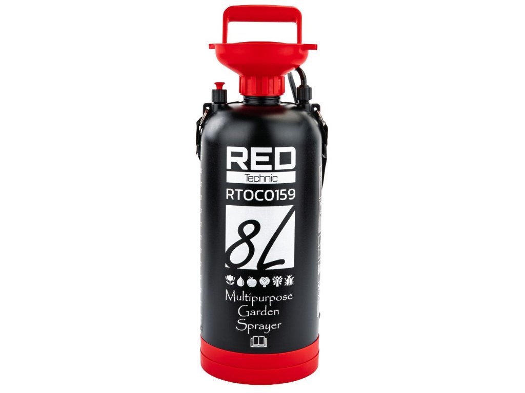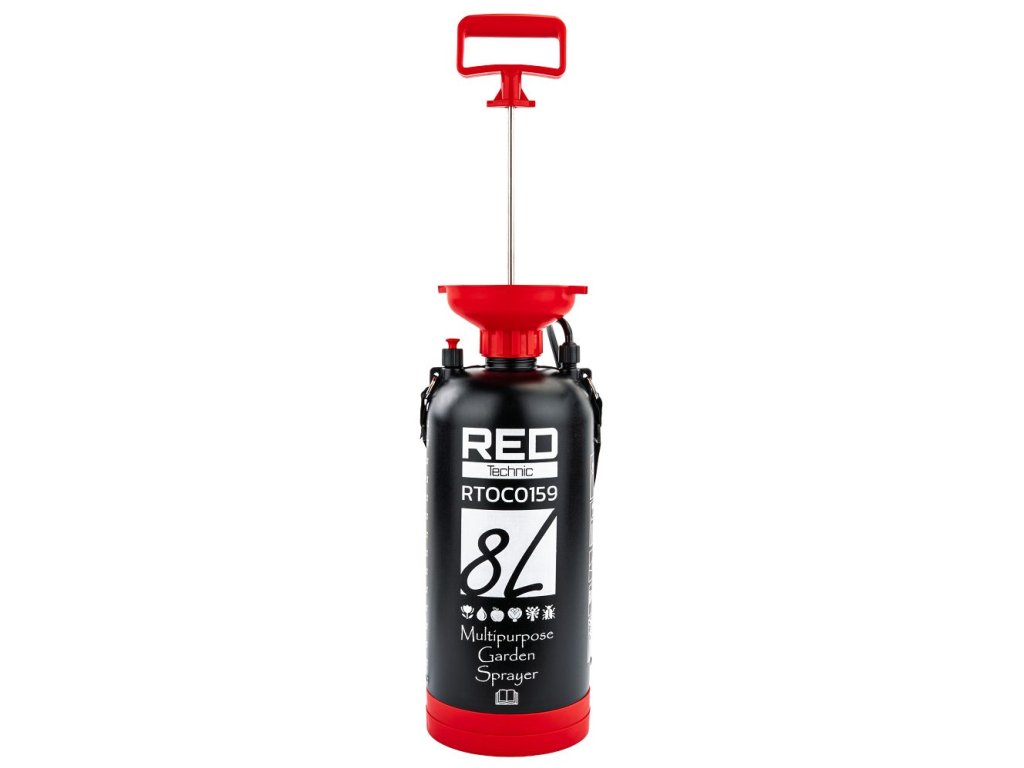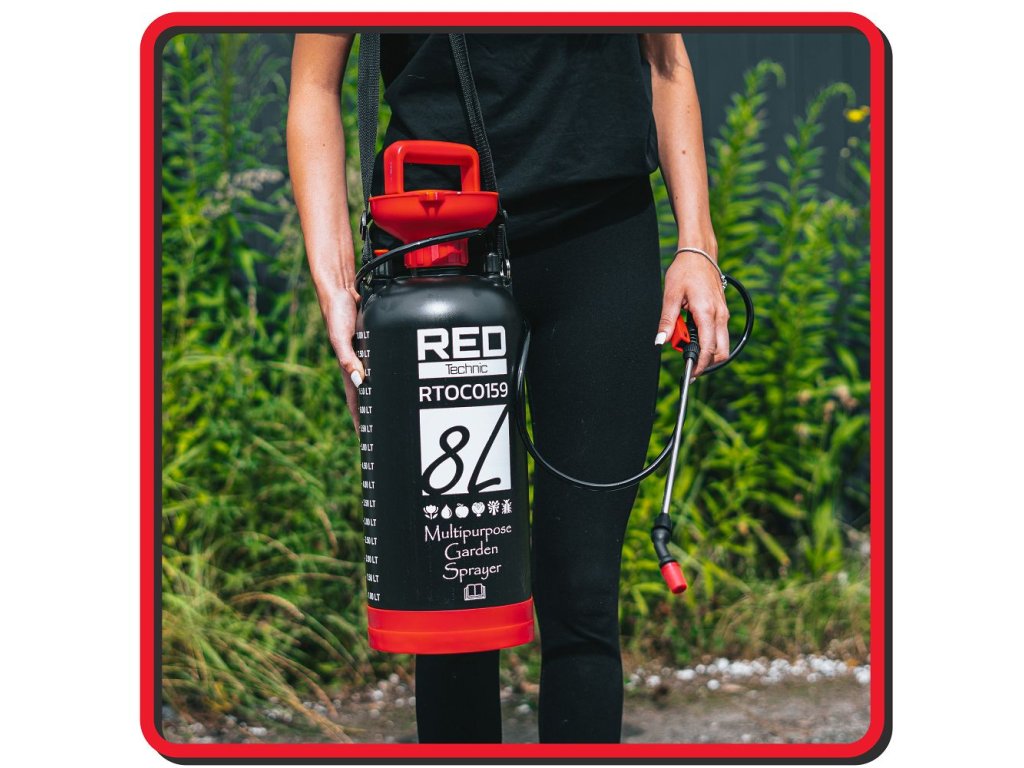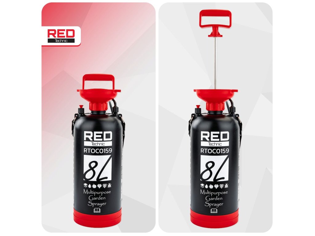 Ruční postřikovač RED Technic RTOC0159 je ideální pomocník pro zahrádkáře, pěstitele i pro domácí a úklidové práce. Díky velké nádrži 8 litrů, ruční pumpě a regulovatelné trysce umožňuje pohodlné a efektivní používání při aplikaci hnojiv, prostředků na ochranu rostlin, herbicidů, pesticidů i dezinfekčních roztoků.