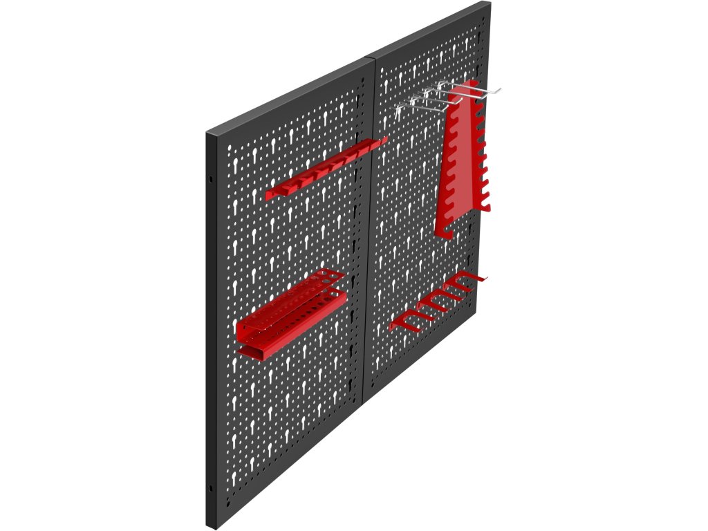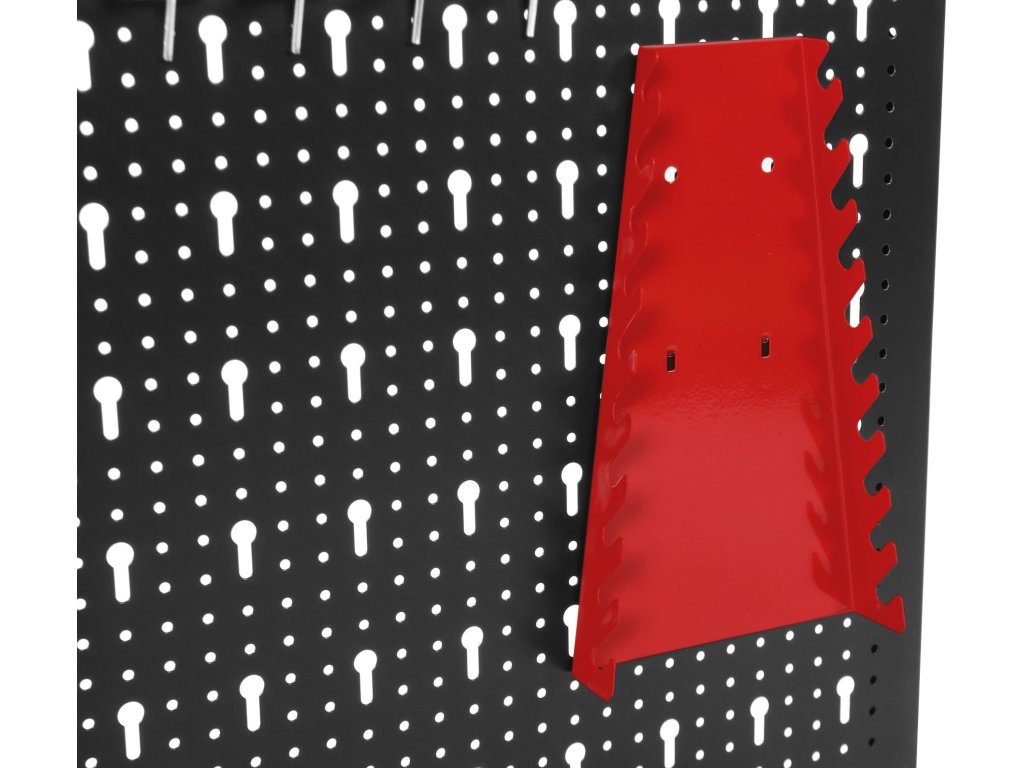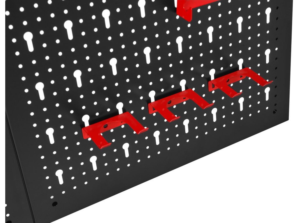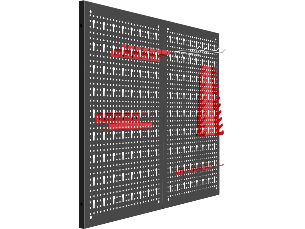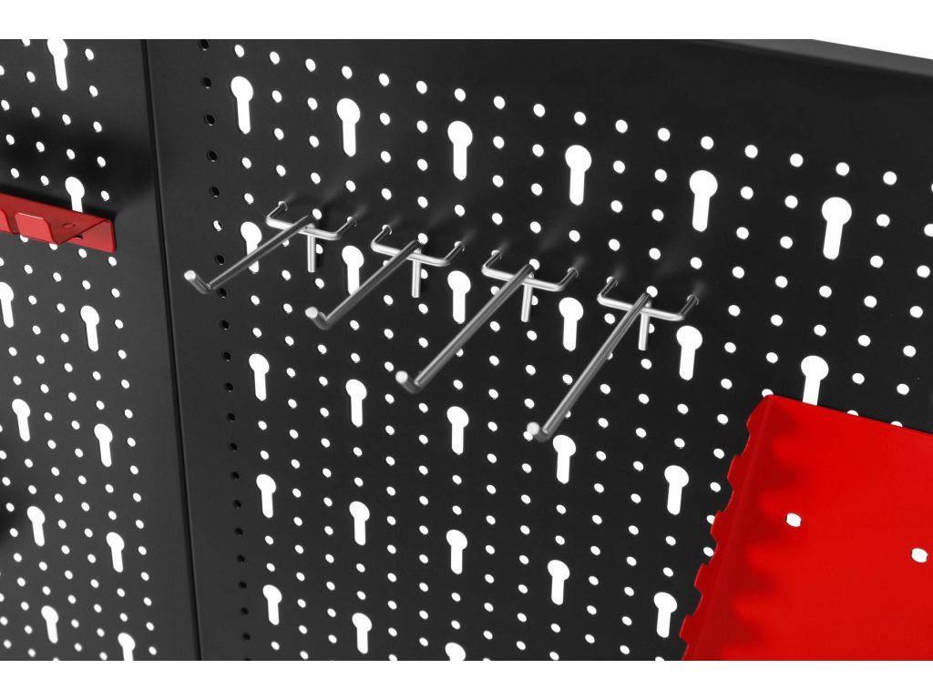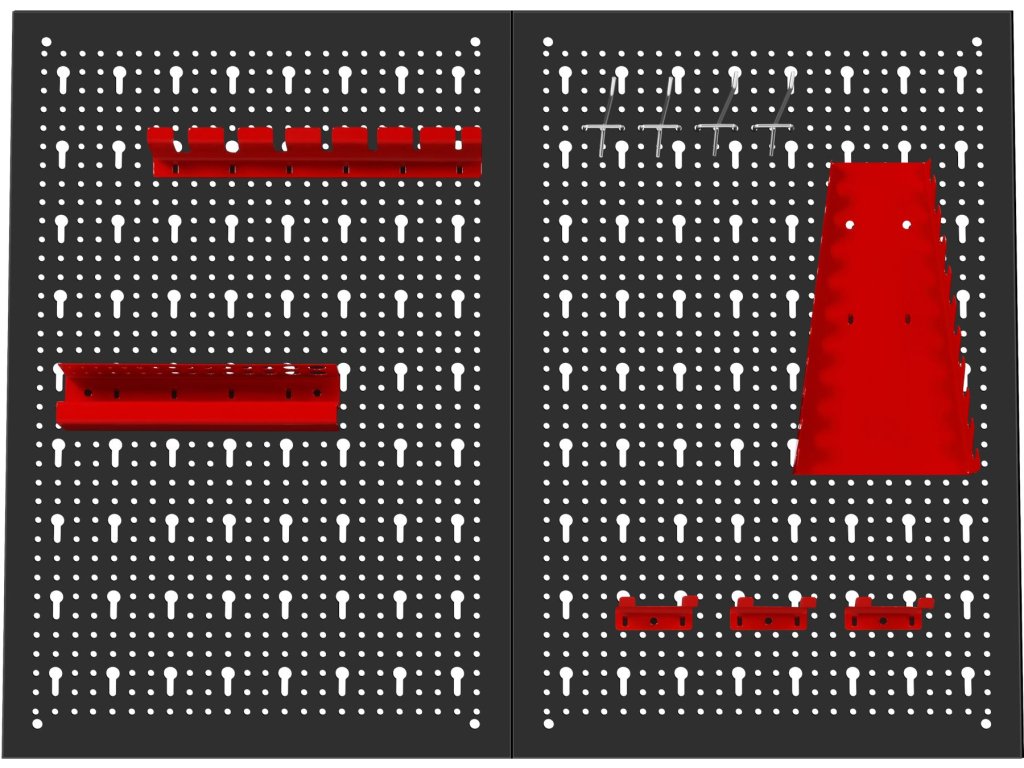 Součástí balení jsou kovové háčky a držáky, které umožňují zavěšení klíčů, šroubováků, kleští a dalšího ručního nářadí. Jednoduchá montáž na stěnu umožňuje rychlé vytvoření přehledného a ergonomického pracovního prostoru.
