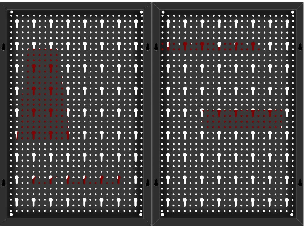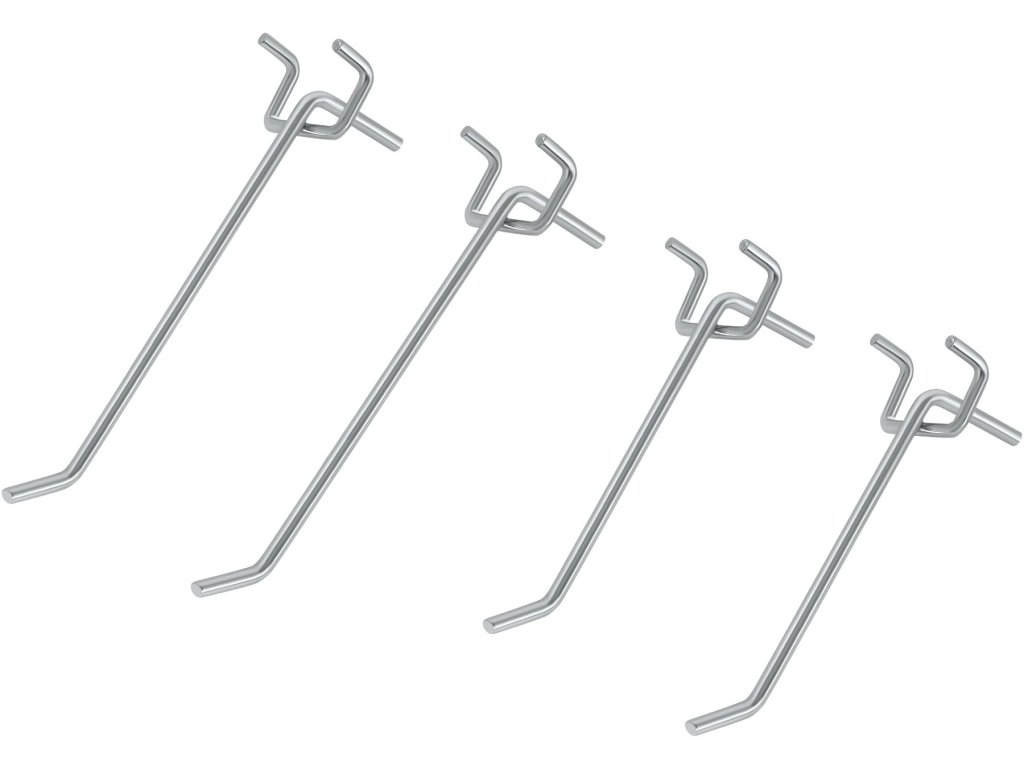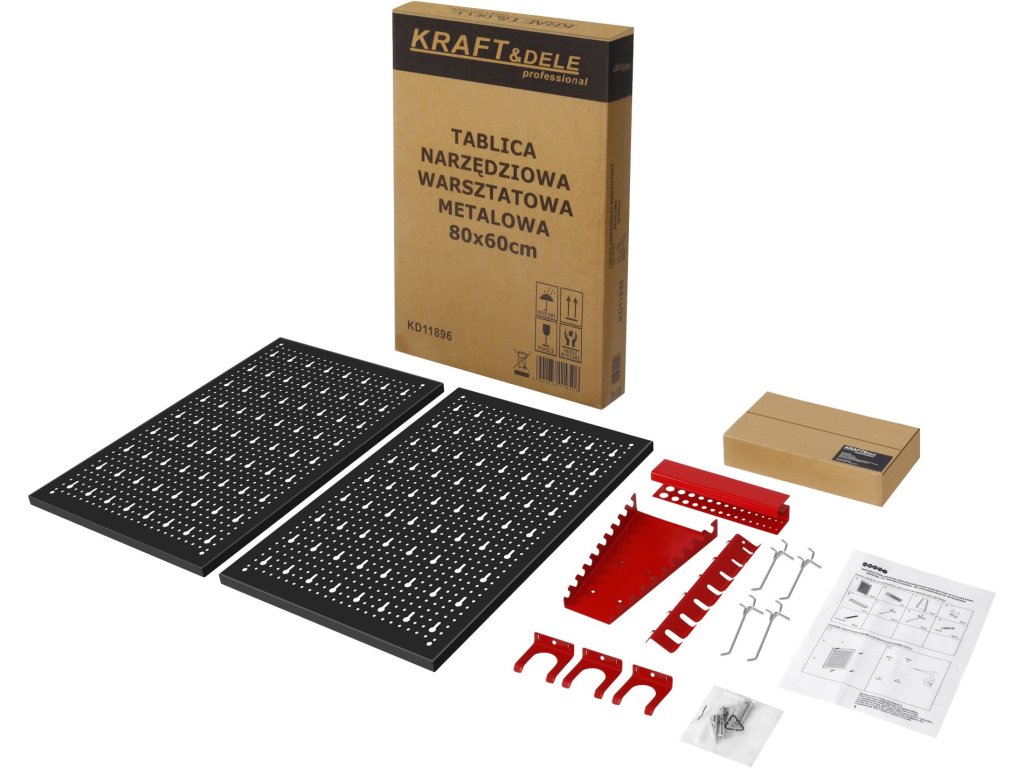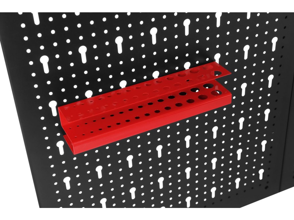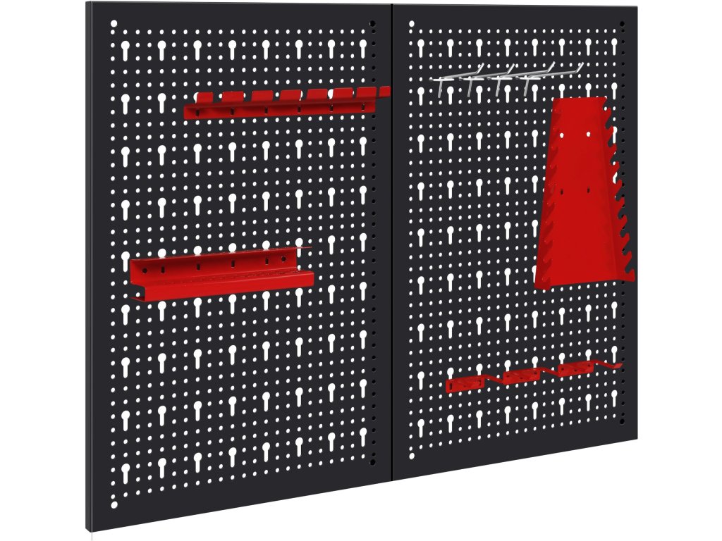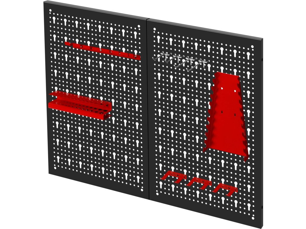Součástí balení jsou kovové háčky a držáky, které umožňují zavěšení klíčů, šroubováků, kleští a dalšího ručního nářadí. Jednoduchá montáž na stěnu umožňuje rychlé vytvoření přehledného a ergonomického pracovního prostoru.