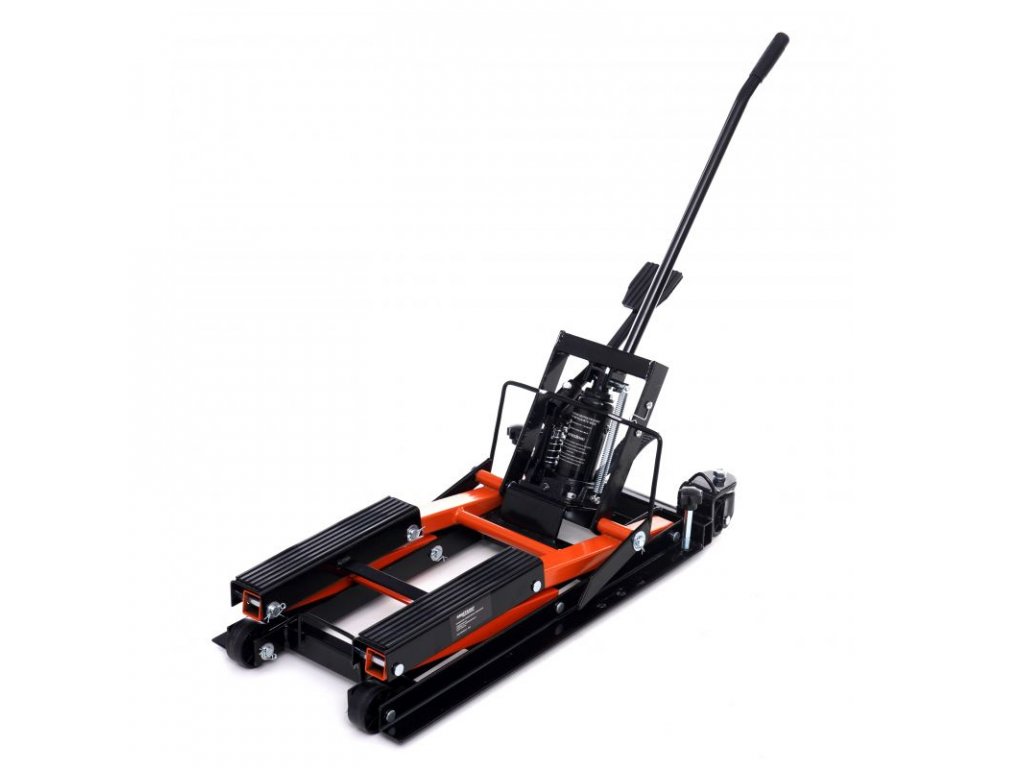Nízkoprofilový zvedák je ideální pro zvedání a spouštění motocyklů, ATV, traktorů na sekání trávy a jiných malých vozidel v garážích a dílnách. Snadné použití, lehké a přenosné, umožní bezpečnou a efektivní výměnu dílů a různých typů oprav. Kvalitní ocel použitá zajistí její trvanlivost a spolehlivost. Gumové prvky chrání rám vozidla. Pohodlná rukojeť zlepší polohu a manévrovatelnost. Zařízení se 2 pevnými a 2 otočnými koly usnadňuje manipulaci. Sklopné mádlo ušetří prostor.